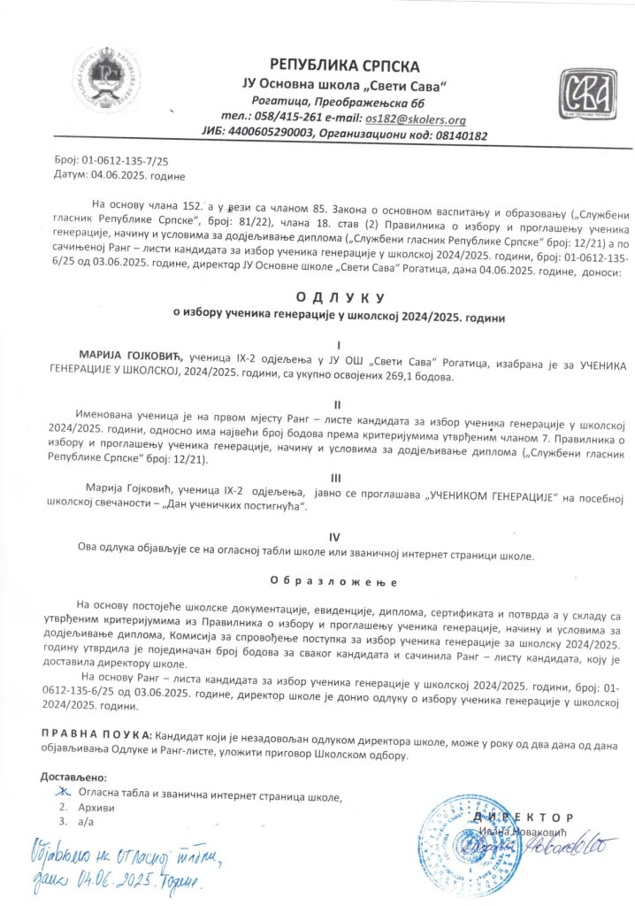 • Одлука о избору ученика генерације и ранг-листа кандидата