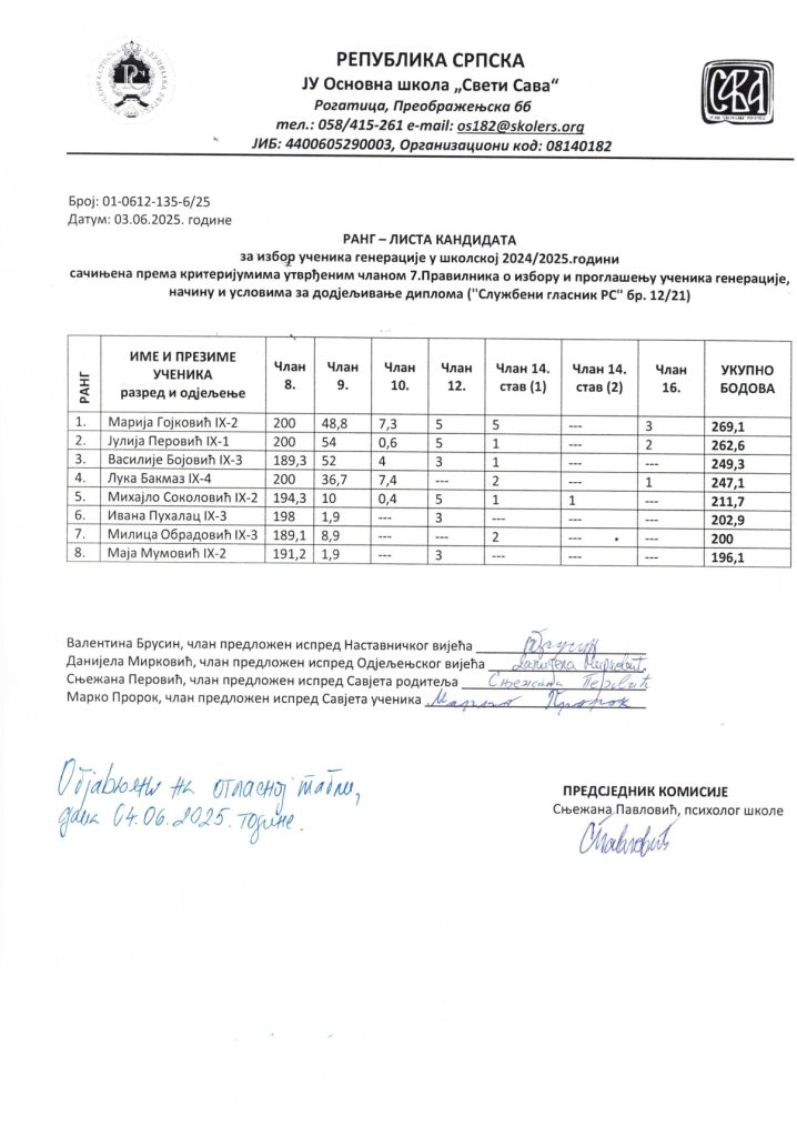 Одлука о избору ученика генерације и ранг-листа кандидата
